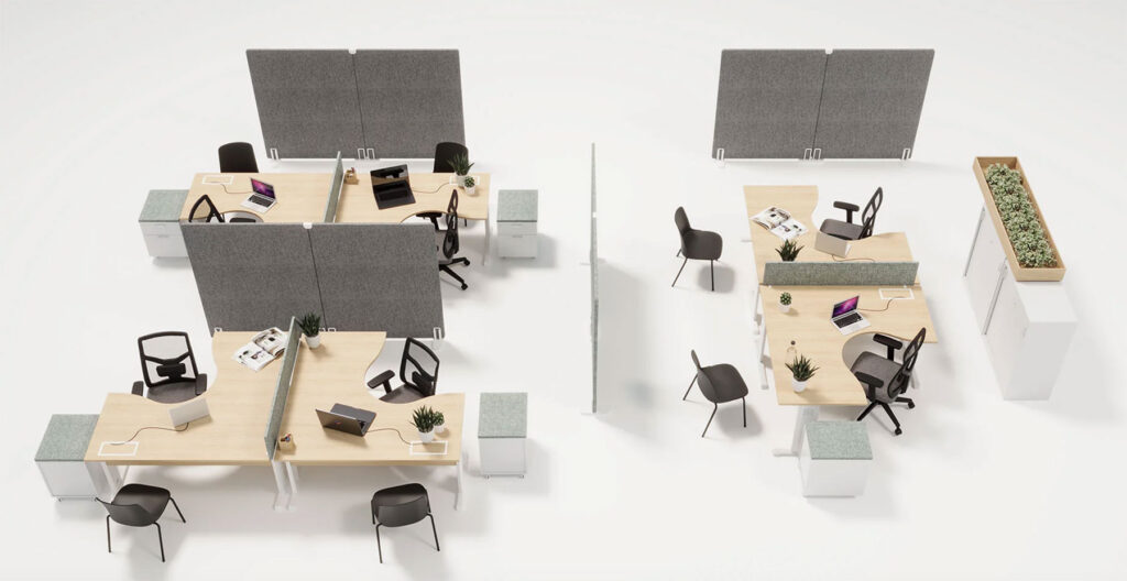 El propio diseño del puesto de trabajo también puede ser un recurso clave para generar independencia. Un buen ejemplo son estas mesas con alas laterales o configuraciones en L que permiten separar de forma natural a los usuarios, al tiempo que amplían la superficie de trabajo. Este tipo de soluciones integra almacenamiento, ergonomía y delimitación en una sola pieza. Cuando, además, se unifica el material y el acabado, se logra un resultado visual limpio y coherente, donde cada puesto queda definido sin necesidad de añadir elementos externos.