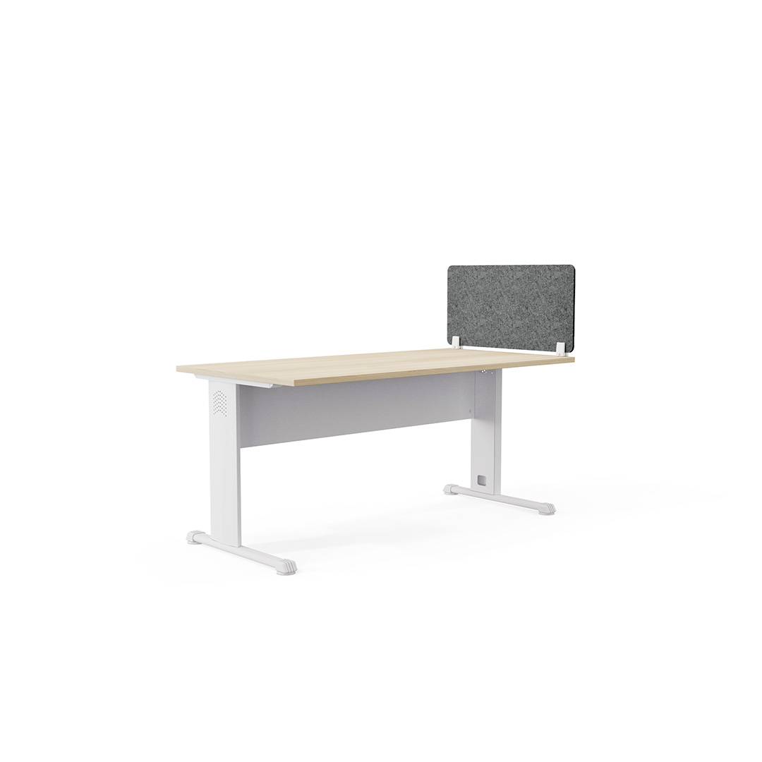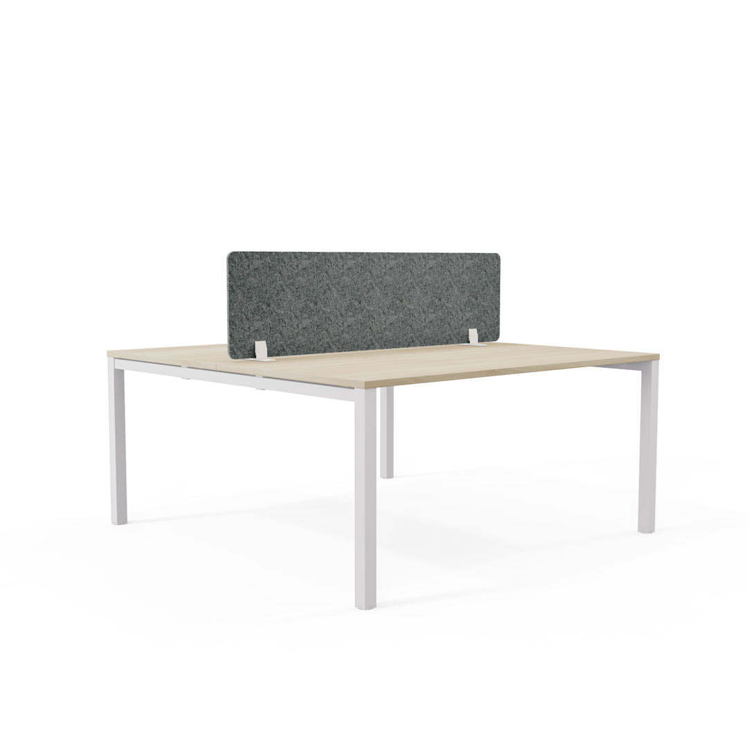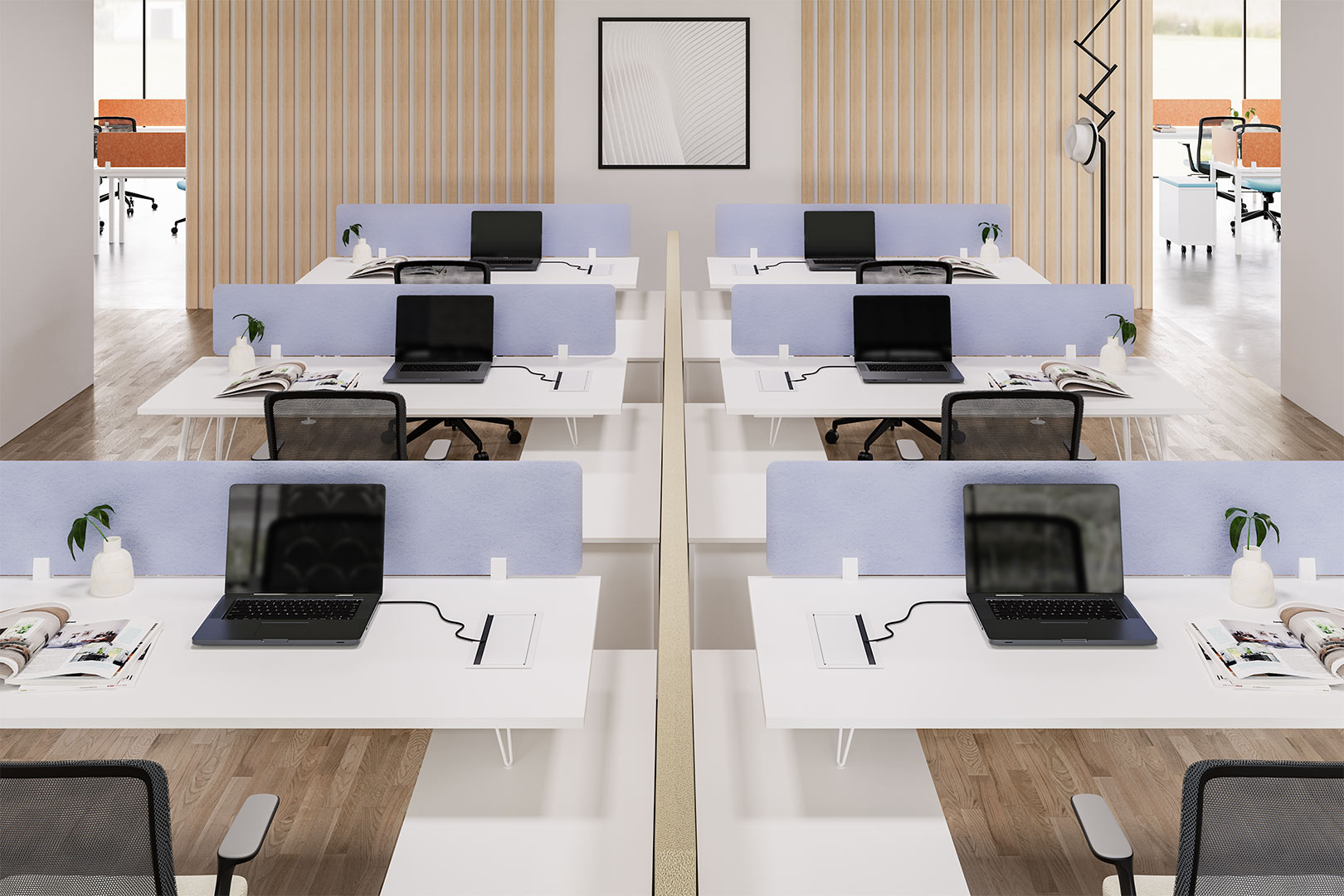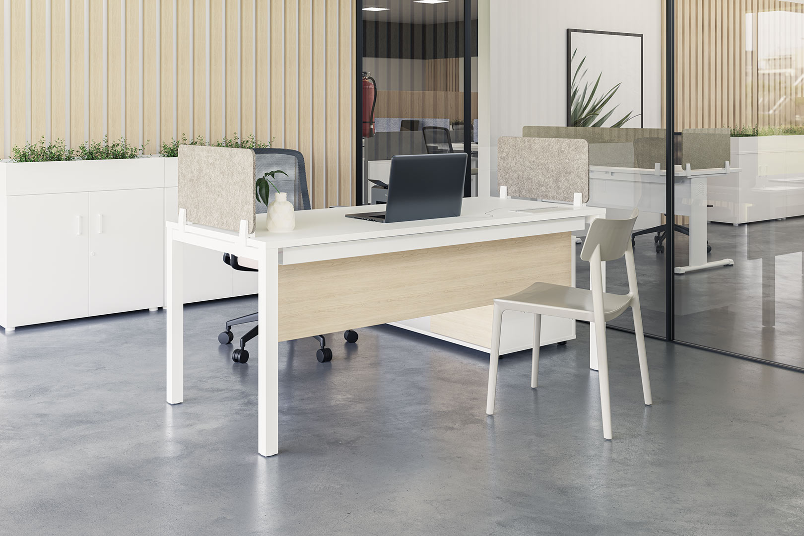 La combinación de separadores frontales y laterales permite crear puestos más definidos y protegidos dentro de configuraciones en línea, mejorando la concentración y el confort del usuario. El sistema de fijación mediante herrajes con pinza asegura una instalación firme y discreta, integrándose en el conjunto sin interferir en la estética ni en la funcionalidad del espacio.