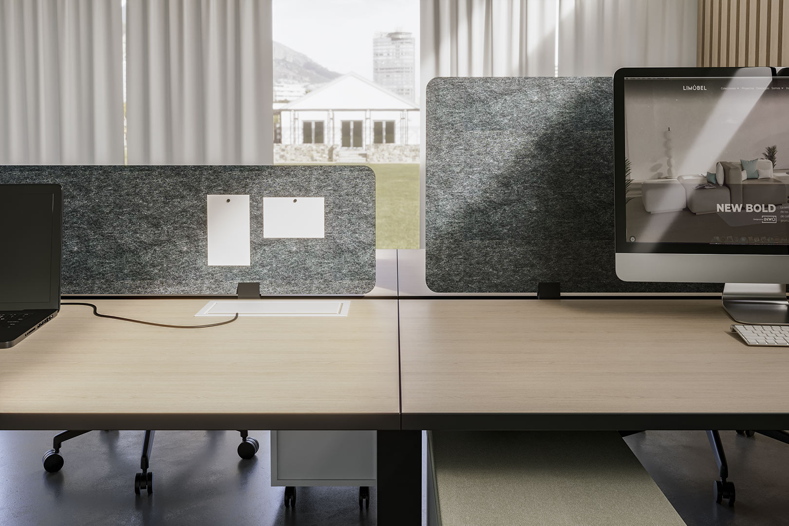 Los separadores RAW PET mejoran el confort y la funcionalidad en los espacios de trabajo compartidos. Fabricados en material reciclado con propiedades fonoabsorbentes, ayudan a reducir el ruido ambiental y a crear zonas más privadas y ordenadas sin perder ligereza visual. Su diseño ligero y resistente, junto con su fácil integración en diferentes mesas y configuraciones, permite organizar y optimizar oficinas y espacios colectivos de forma sostenible y eficiente.