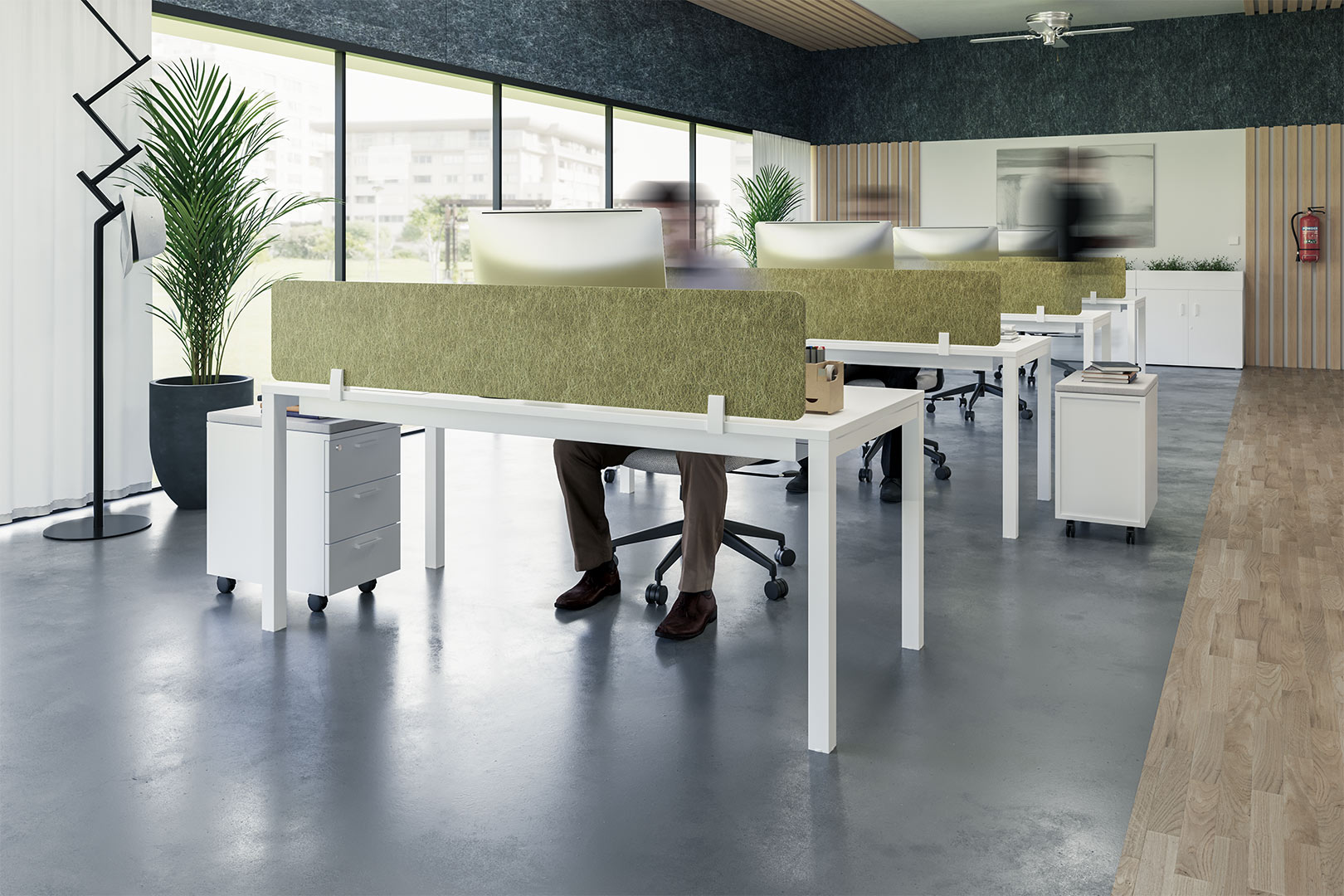 La mesa Hidra con separadores frontal y lateral en verde liquen permite mantener la comodidad de un espacio compartido, a la vez que cada usuario disfruta de privacidad y concentración, ideal para entornos colaborativos donde se necesita un poco de aislamiento visual y acústico.
