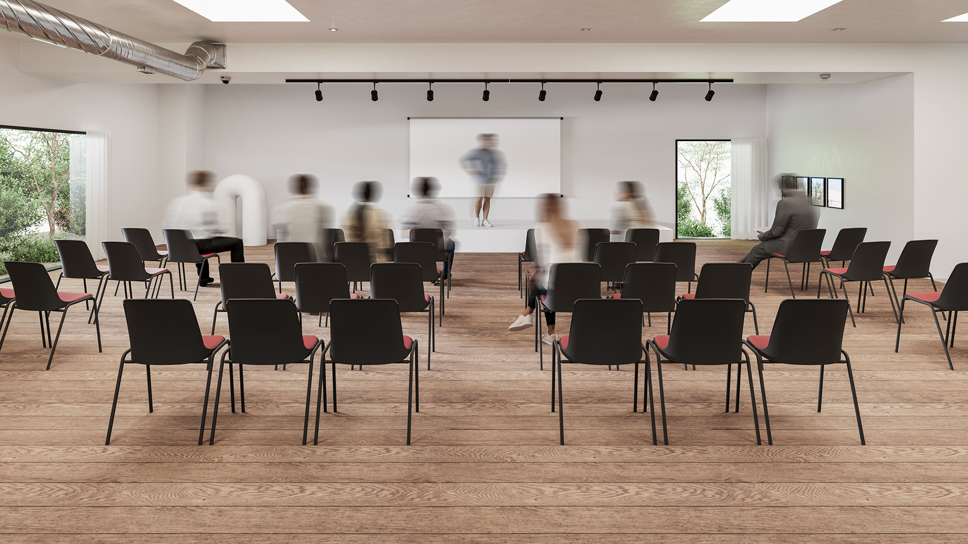En un auditorio contemporáneo, la silla Marca en acabado negro absoluto marca el ritmo del espacio. Su carcasa y estructura metálica unificadas en tono oscuro contrastan con las galletas tapizadas en textil rojo, que aportan carácter y energía al conjunto. Ordenadas en filas precisas, proyectan una imagen sólida, elegante y preparada para acoger cualquier conferencia con estilo y comodidad.