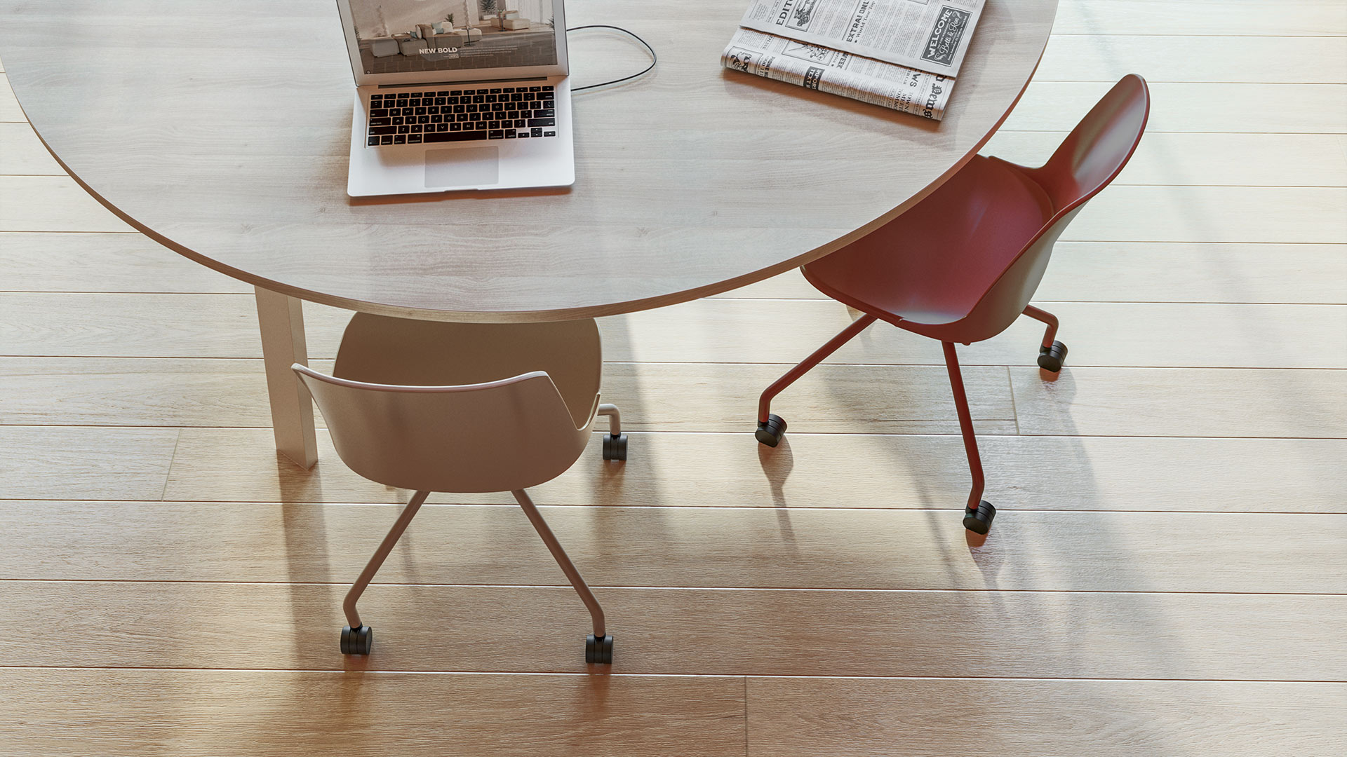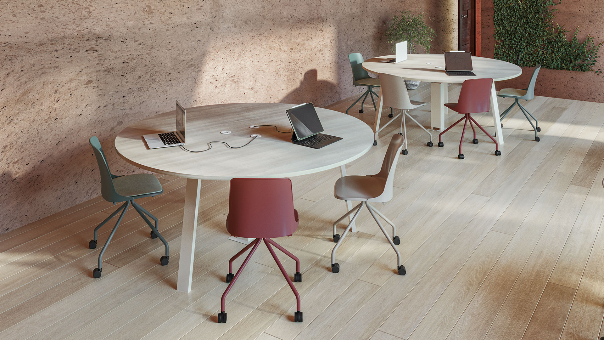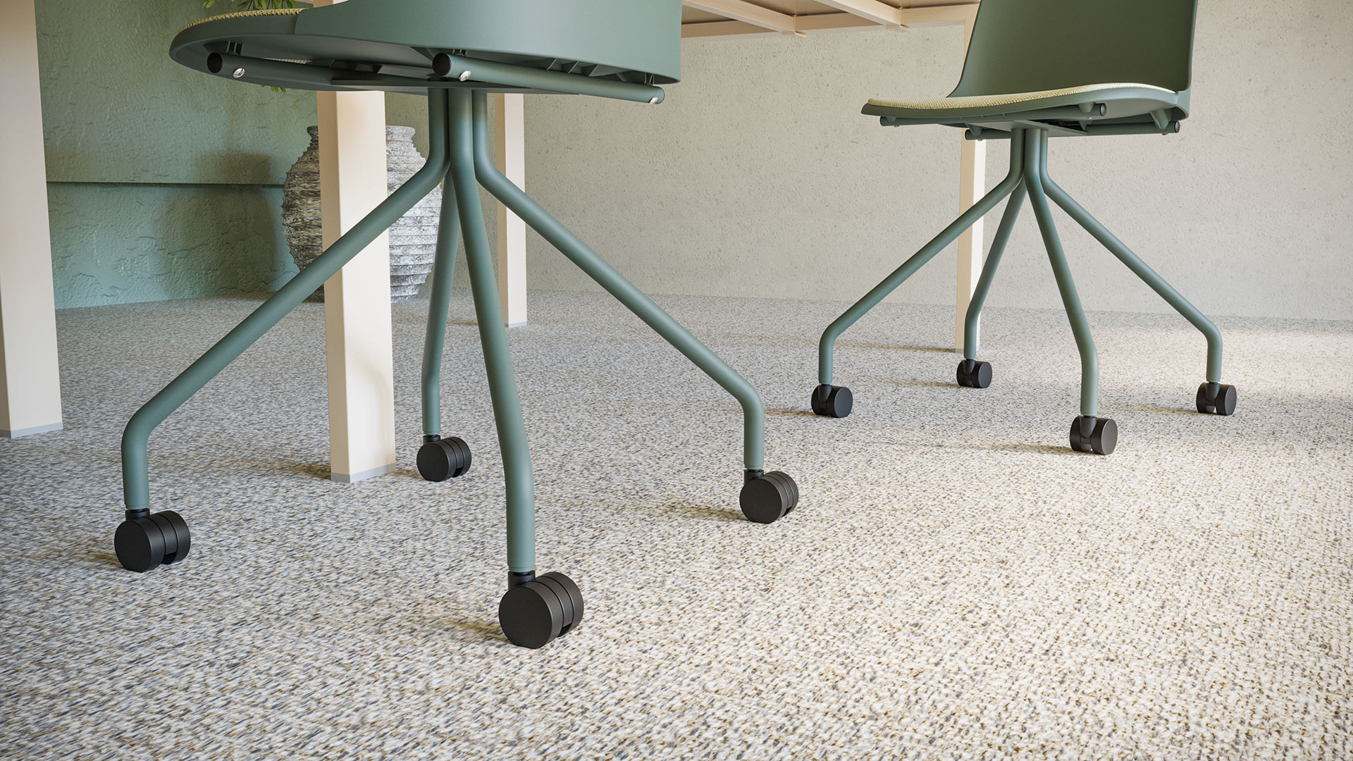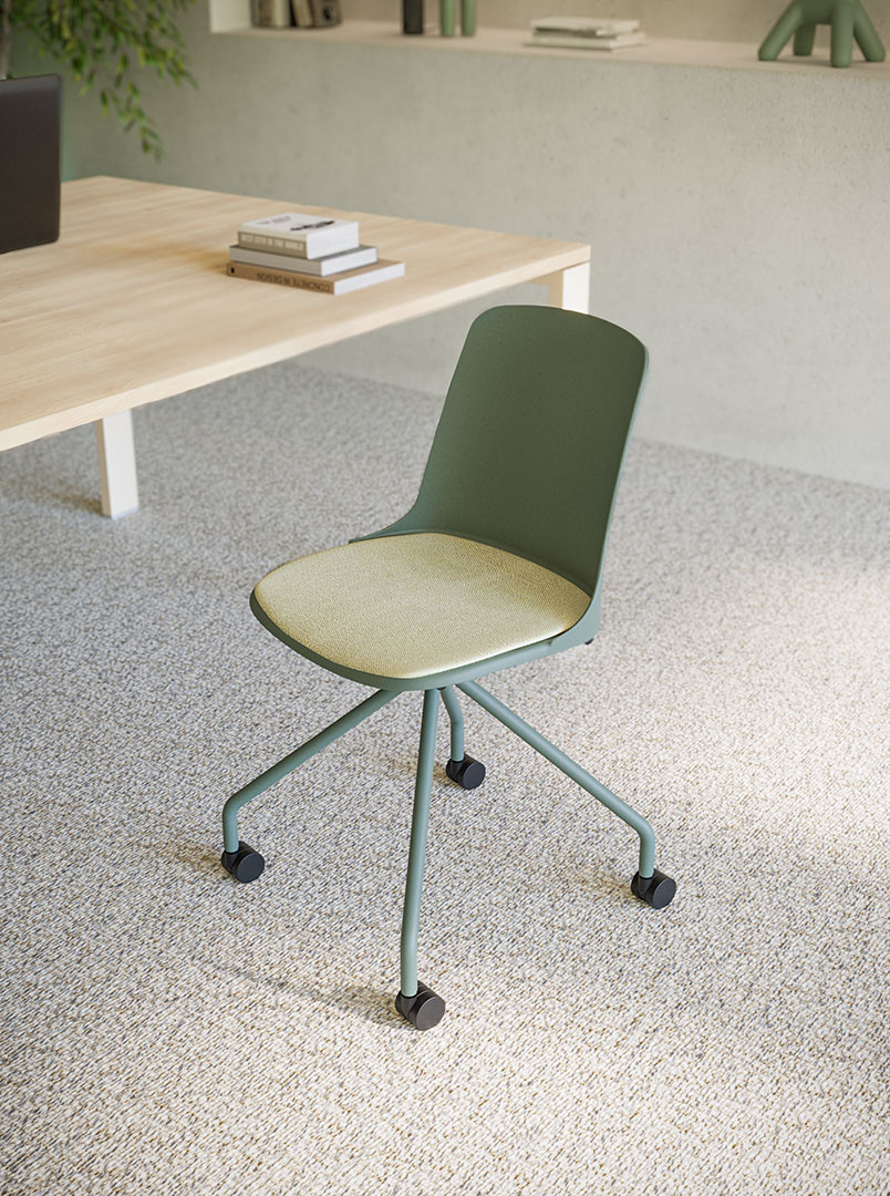 En una sala de reuniones bañada por luz natural, de inspiración mediterránea y atmósfera serena, la versión Marca con base de cuatro radios piramidales y ruedas aporta frescura y movimiento. Su carcasa en tono verde suave dialoga con el entorno luminoso, mientras la galleta tapizada suma confort y calidez. Funcional y ligera, se integra con elegancia en espacios pensados para compartir ideas y avanzar.